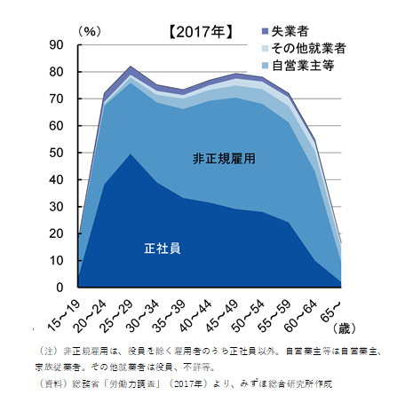 (3)正規雇用では、逆L字型 ・・・ ところが、女性の正規雇用についてみると、出産前後の年齢で大幅に下降し、30才代以降では、非正規雇用が中心の「逆L字型」となっています。正規雇用から一旦離職した女性達が労働市場に復活するときは、圧倒的に非正規雇用となっているのです(図2)。