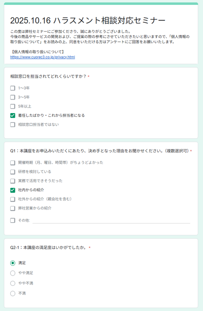 - ハラスメントに関するセミナーを受けるのは初めてでしたが、わかりやすい内容で今後の業務に活かせると思いました。